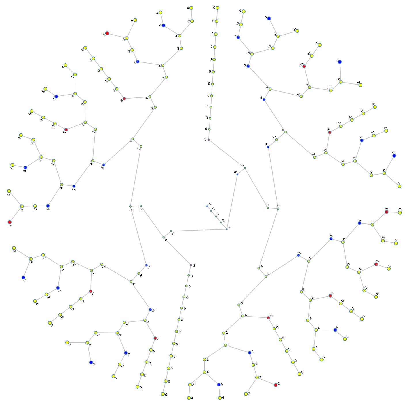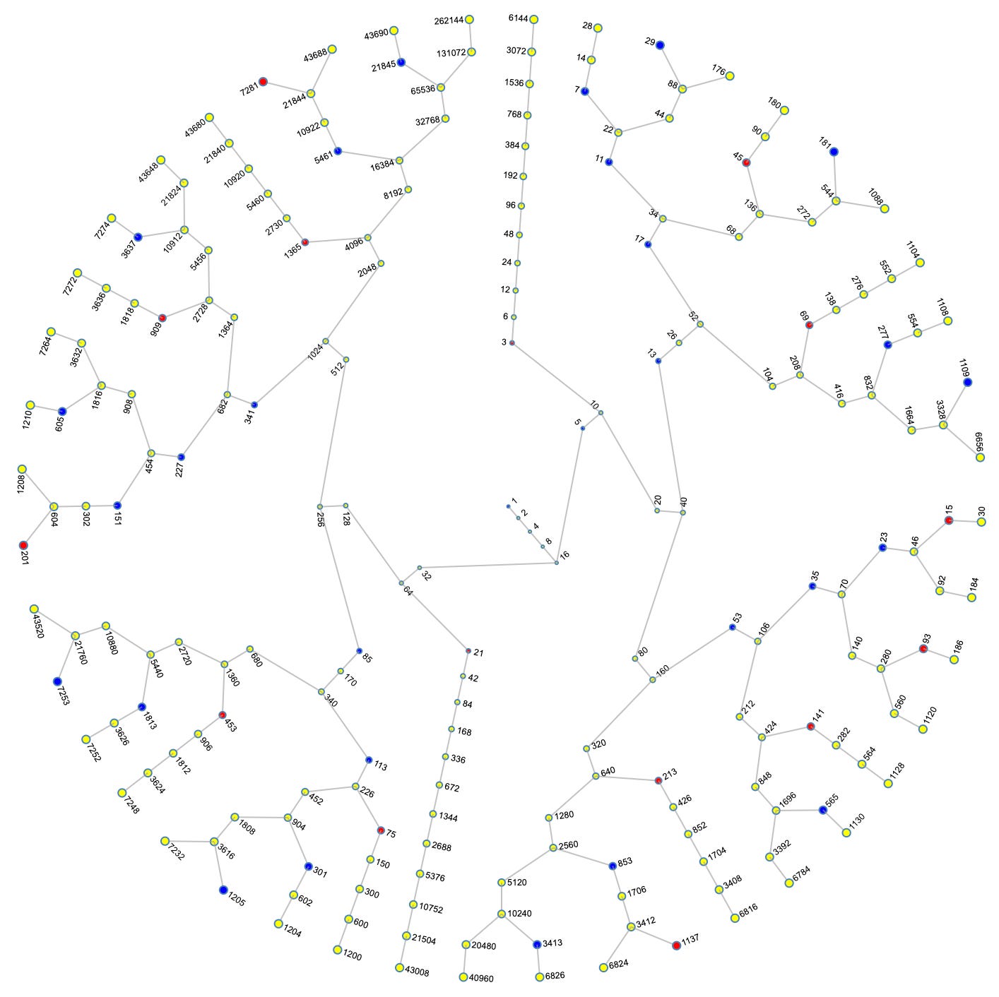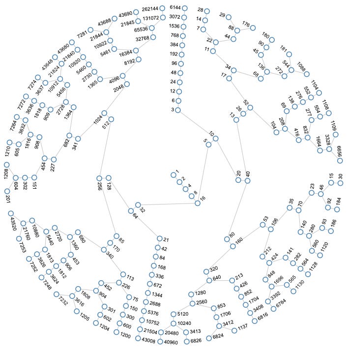 In terms of structure, what is most visually notable about the ICM is the “branching,” or lack thereof. Indeed, branching appears to have quite a multitude of “stems” of two numbers, e.g., (5, 10), (32, 64), etc., a lesser multitude of stems of three numbers, e.g., (13, 26, 52), (85, 170, 340), etc., a few stems that appear to continue indefinitely, e.g., (3, 6, 12…), (21, 42, 84…), etc., and one original stem of five numbers (1, 2, 4, 8, 16), which as it turns out, is just a stem of three numbers concatenated with a stem of two numbers.