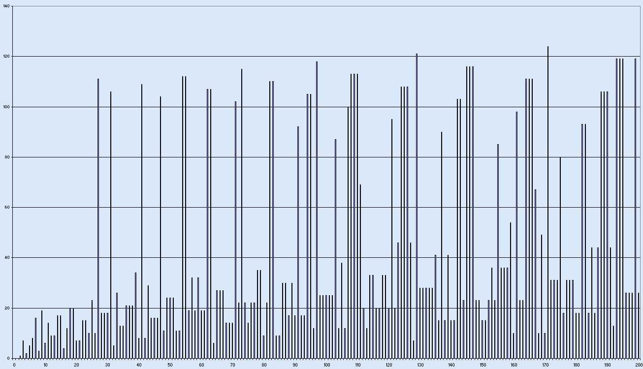 Looking at the total stopping times for C(n) for the first couple of hundred values of n one might quite reasonably think that the function behaves rather randomly: